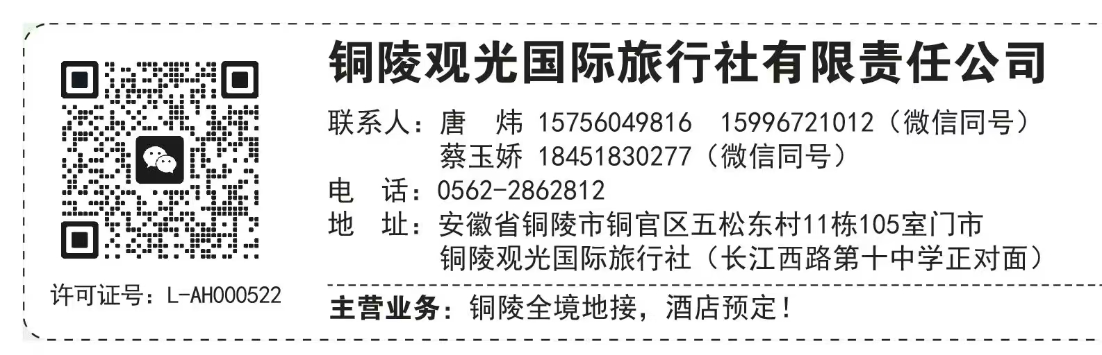 Copyright 安徽銅陵市觀光旅行社有限責(zé)任公司 地址: 安徽省銅陵市長江西路第十中學(xué)正對面銅陵觀光國際旅行社(五松東村11棟105)
